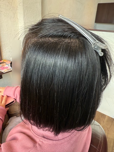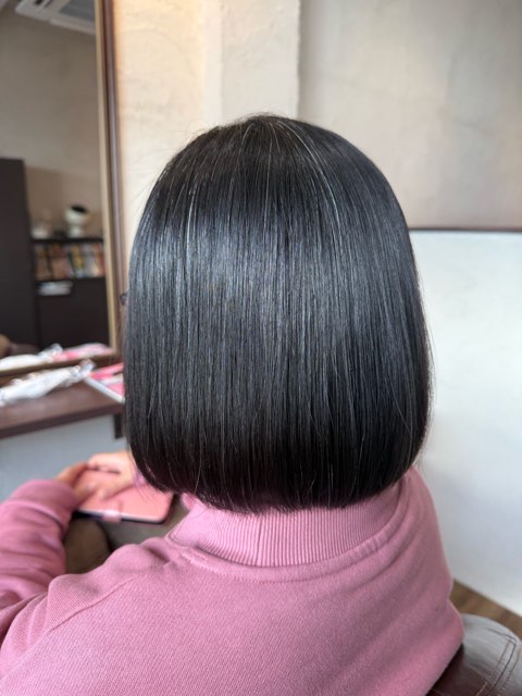 T様は丸みのあるボブがご希望なのと、毛先の状態も薬剤に耐えられると判断して全体矯正になりました。